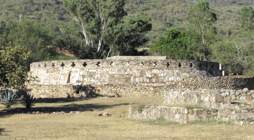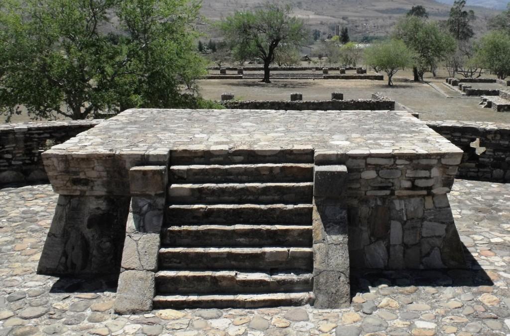 Once you get past Compostela, you can get on the autopista. About 12 km. before Ixtlan del Rio you will see the lavafields from volcan Ceboruco. Nothing but black lava rock that covers every surface for more than a mile and where nothing grows. Exit at Ixtlan del Rio and drive through town and the site will be just on the outside of town. It’s a small site which can be seen in 45 minutes. There are many temple and building foundations and one circular structure with two temples atop it. There are also several sculptures on display that were found on site.